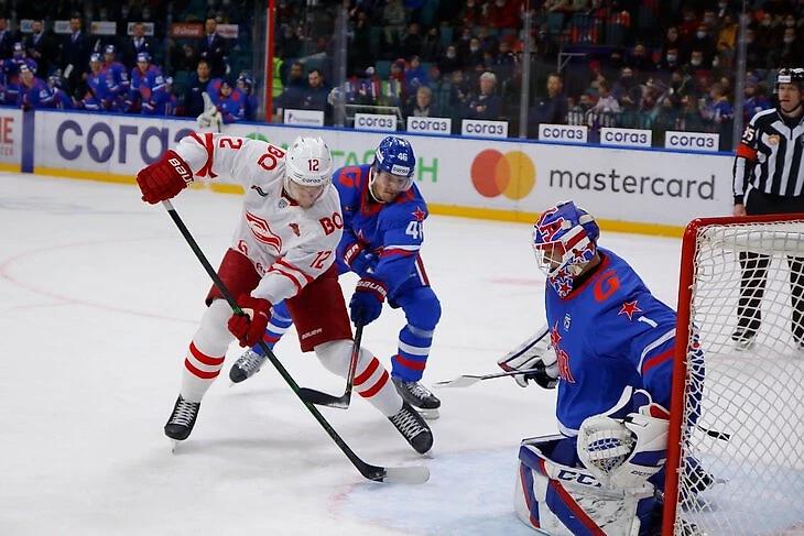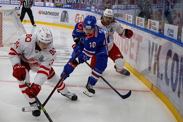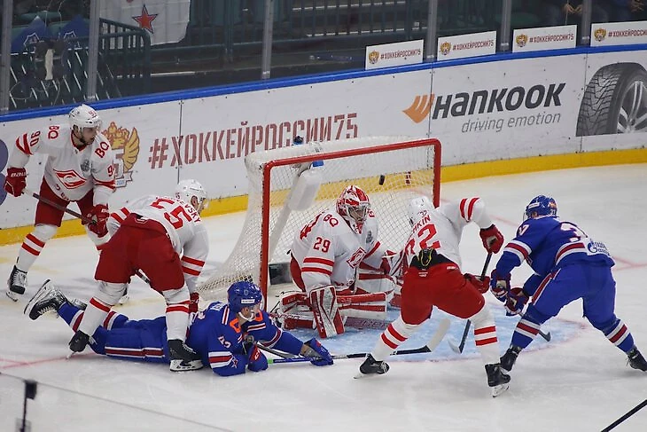 «Спартак» в завершении играет довольно просто. Он играет вертикально, прямо на чужие ворота и сразу на пятак. Половина его шайб в первом матче – это удачные отскоки от игроков СКА, вторая половина – ошибки игроков СКА. Шайба во второй игре – снова ошибка игроков СКА, реализованная максимально просто, быстро и эффективно; да, там было филигранное оставление Лехтери – и это было красиво. С периметра у москвичей пробует атаковать только первое звено Хохлачев – Лехтеря – Широков, в принципе «Спартак» на контроле шайбы не настаивает. Его защитники не отбрасываются, ищут варианты для контролируемого выхода из зоны, но в целом команда готова к тому, что с шайбой больше будет СКА. И планирует свои атаки, исходя из этого расклада.