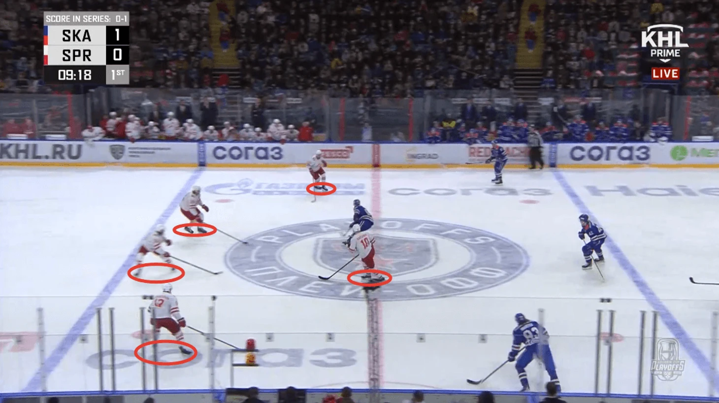 Обратите внимание на действия остальной спартаковской четверки: хоккеисты работают по игрокам, передавая их другу другу и по возможности сокращая для тех игровое пространство, ожидая рывков, передач и прочего конструктива. «Спартак» готов практически к любому решению игрока с шайбой, к любой передаче – и в силу того, что современный СКА не самый острый карандаш в пенале хоккейного интеллекта, эта плотность заставляет армейцев просто вбросить шайбу в чужую зону – на подбор первыми идут два спартаковца.