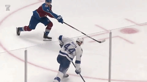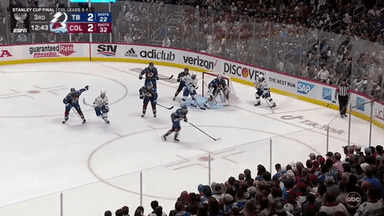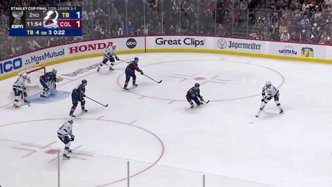 Началось с того, что на вбрасывание вышли ведущие звенья команд. Но с одним нюансом. У Колорадо целиком вся пятёрка (пара защитников Тейвз - Макар и тройка Маккиннона), а Тампы пару Сергачёв - Хедман сменила пара Макдона - Чернак. Вся смена от вбрасывания до гола уложилась в 45 секунд (начали за 7:07 до конца периода, гол забили за 6:22). В первой половине этого отрезка Колорадо играл по своей привычной схеме - жёсткий агрессивный прессинг с целью не дать сопернику выбраться из своей зоны или хотя бы со своей половины. Первая попытка отбора удалась - шайба вышла из зоны Тампы и тут же вернулась обратно. На это ушло 30 секунд. К этому моменту игроки Колорадо уже, видимо, наелись и вторая попытка прессинга не удалась - Ничушкин не смог накрыть Стэмкоса, который подкатился к защитникам, чтобы помочь.