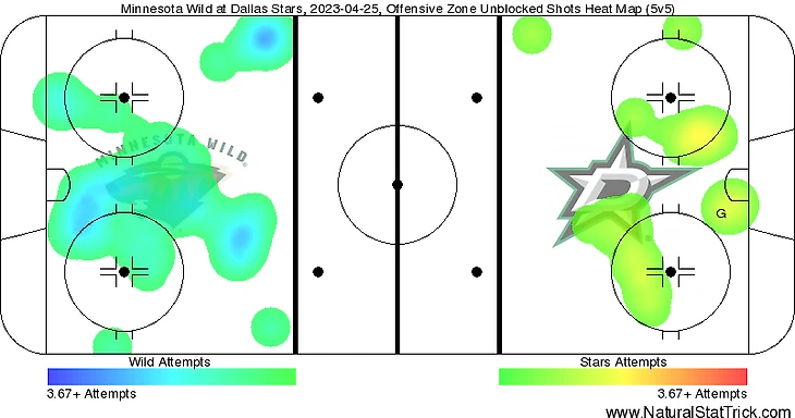 Просто по моментам при 5-на-5 «Миннесота» выиграла 19-12 – и вот как выглядит тепловая карта бросков: атаки «Далласа» на ней будто бы и нет.