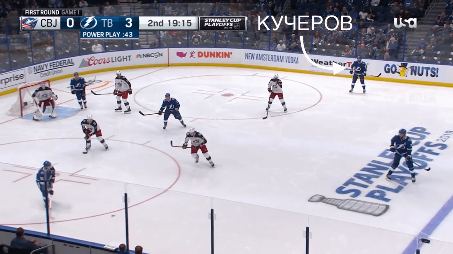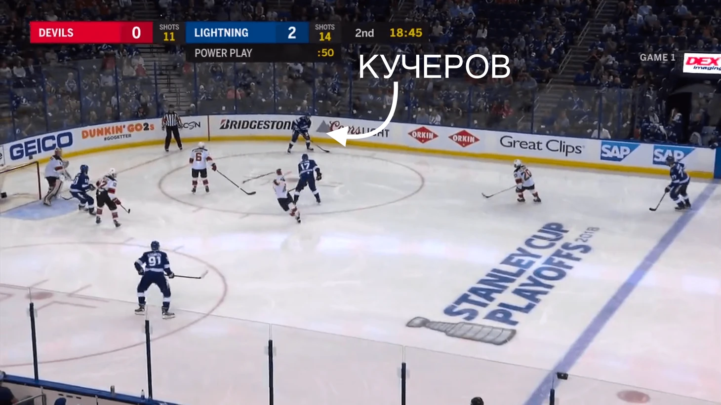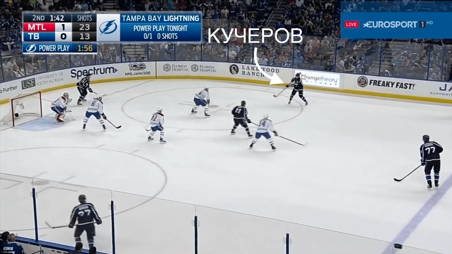 Смотрите: после перевода от Хедмана Кучеров резко в касание скинул в центр Пойнту. Последние годы после этого хода шел бросок от Брэйдена – но Кучеров не делал ложного замаха, он просто быстро передал шайбу партнеру.