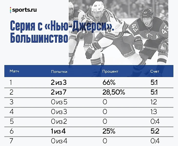 Но серия против «Девилс» в смысле большинства стала хтоническим сериалом «Твин Пикс». И «Рейнджерс» пронесли нас на качелях: от безумной реализации в первых двух матчах до ну вообще никакой на финише.
