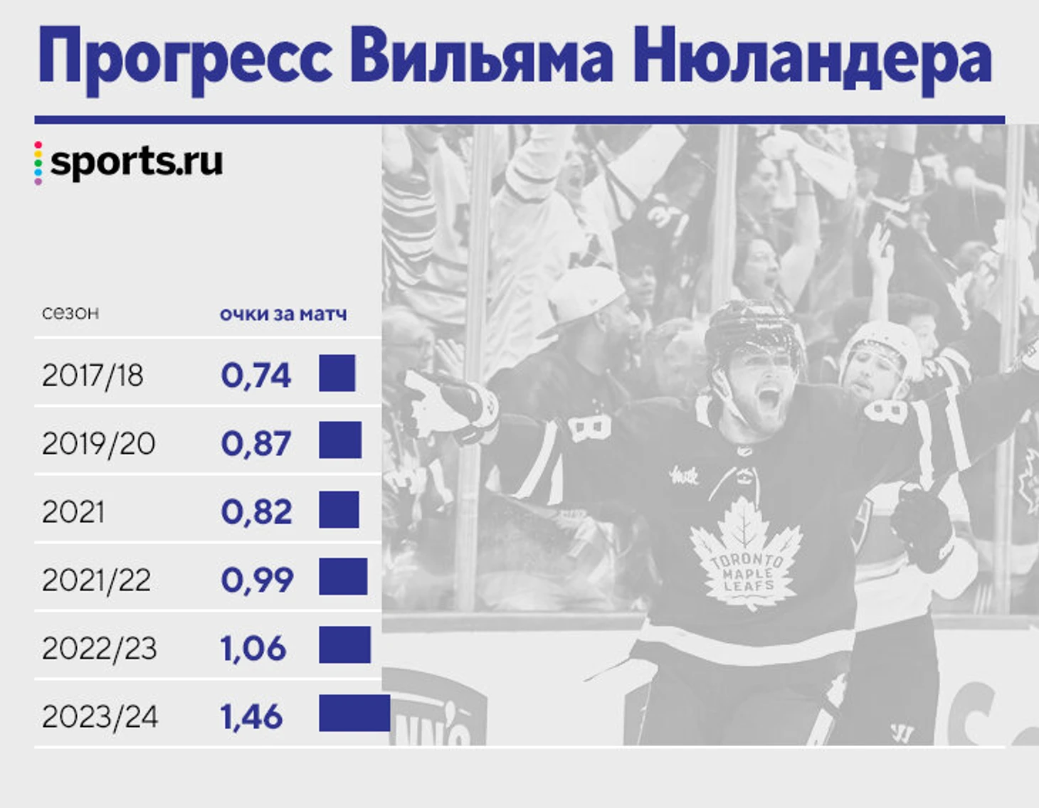 Прошлый сезон Нюландера был похож на прорывной: 40 шайб, 47 передач, 10 очков в 11 играх плей-офф (там Вильям стабильно выглядит покрепче своих суперзвездных партнеров). Для торгов по новому соглашению очевидно принципиальным было понимание дальнейшей траектории: если игрок удержится на этом уровне продуктивности, это один разговор.