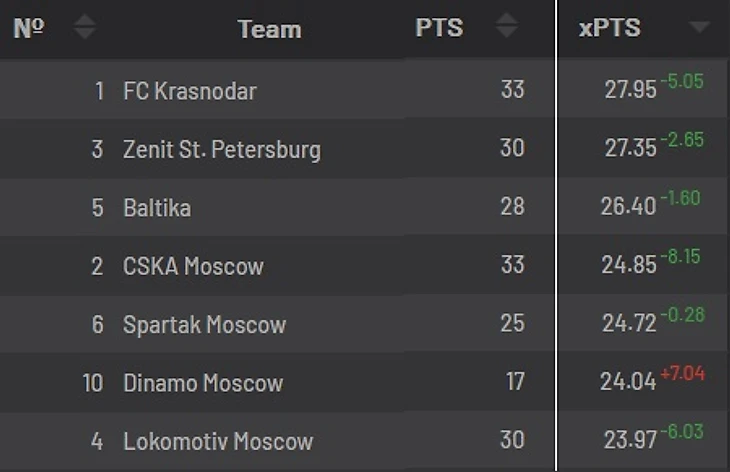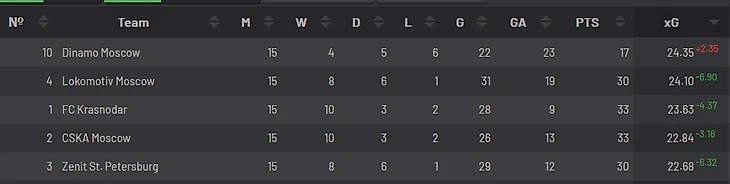 По ожидаемым очкам Динамо должно занимать 6 место, опережать Локомотив, который многие хвалили и по делу, и отставать от лидера чемпионата Краснодара на 4 очка (а от ЦСКА и вовсе на очко)! Армейцы вырывают на зубах такие матчи, с Динамо Мх, А Динамовцы теряют очки в матче с Тольятинским Акроном, который выиграли по xg.