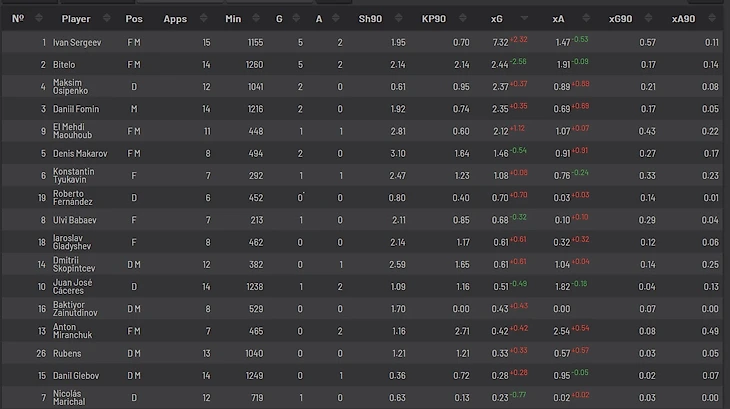 Тут мы можем вспомнить досадные промахи Ивана Сергеева с убойных позиций, когда форвард Динамо должен был записывать на свой счет голевое действие. Отсюда отрицательная статистика по ожидаемым голам. Но не стоит говорить только про Сергеева. Практически все игроки основного состава Динамо имеют отрицательную статистику по ожидаемым голам. Из всех игроков выделяется Бителло, который забил больше, чем ожидалось, но это исключение. А как говорится исключение подтверждает существование правила. К сожалению, Иван Сергеев пока не оправдывает вложенные деньги в его трансфер, а Тюкавин не набрал нужных кондиций после травмы крестообразных связок. Большое количество травмированных фланговых вингеров (Гладышев, Артур Гомес, Макаров) и травма, набравшего ход Миранчука, не позволили Динамо рассчитывать на большее в атаке.