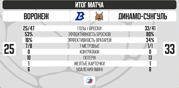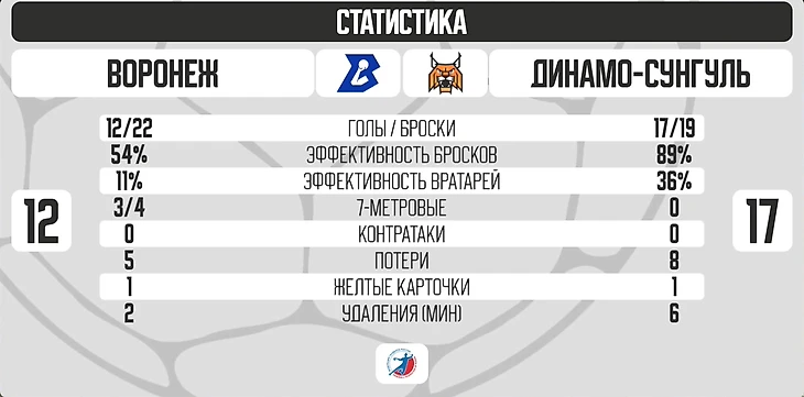 Эффективность бросков на голову выше было у «Сунгуля», также лучше отыграл Иван Шаров, нежели вратари хозяев. Как это часто бывает, гости сделали больше потерь и удалялись чаще соперников.