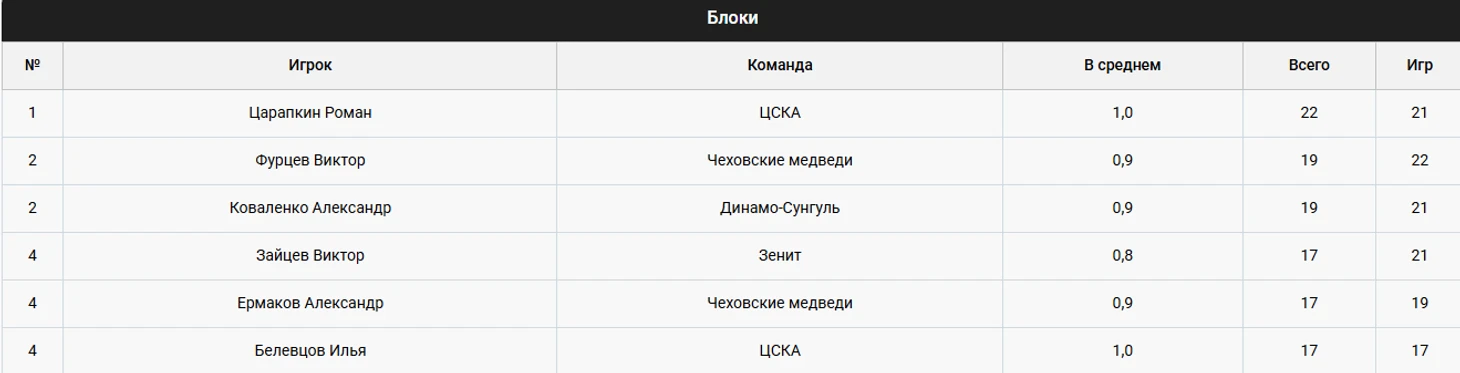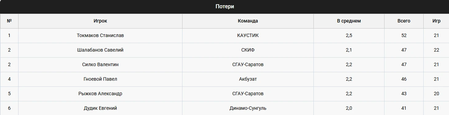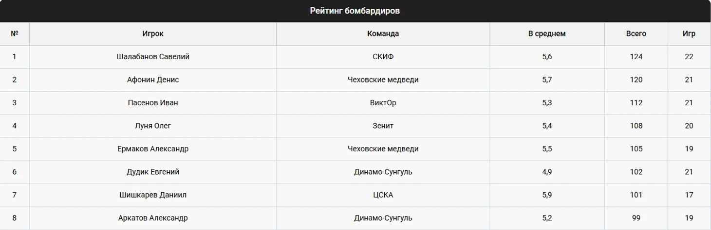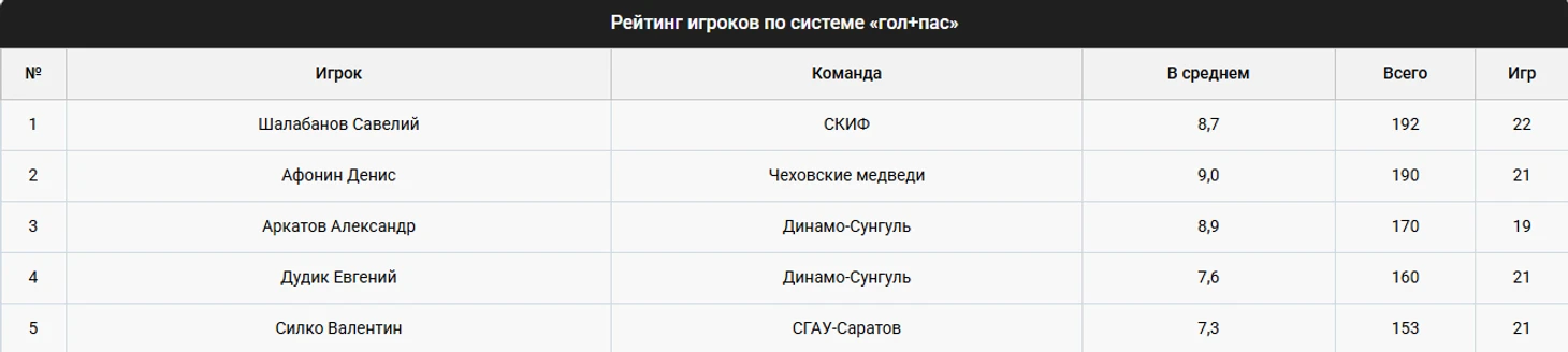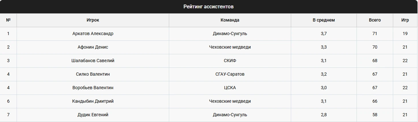 А среди ассистентов Александр Аркатов стал лучшим в лиге, Евгений Дудик на седьмой строчке.
