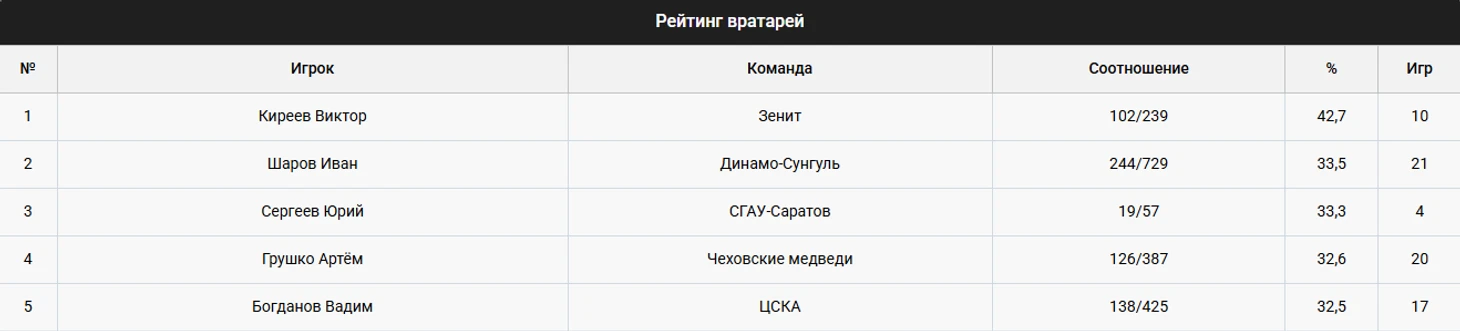 В рейтинге стражей ворот Иван Шаров на уверенной второй строчке, уступая лишь Виктору Кирееву с берегов Невы. Но Иван провел в два раза больше игр.