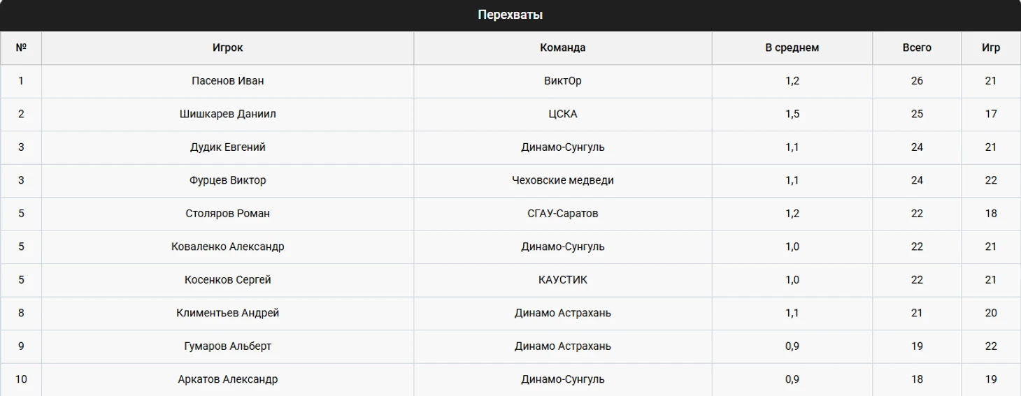 По перехватам в лучшей десятке Евгений Дудик, Александр Коваленко и Александр Аркатов.