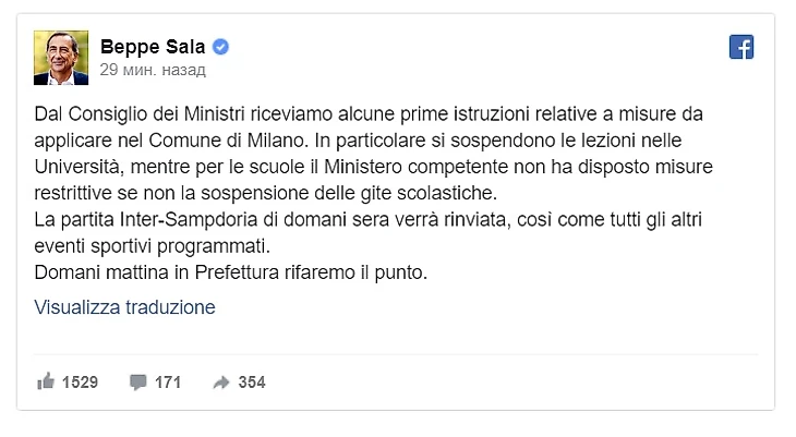 «От Совета министров мы получаем несколько первых инструкций, касающихся мер, которые должны применяться в муниципалитете Милана. В частности, занятия в университетах приостановлены, в то время как для школ компетентное министерство не назначило ограничительных мер, кроме приостановки школьных поездок. Завтра будет отложен матч Интер-Сампдория, как и все другие запланированные спортивные мероприятия. Завтра утром в префектуре мы рассмотрим перенос игры».