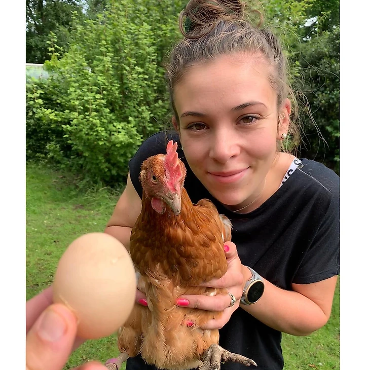 Софи вообще любит животных – и не только собак. Посмотрите, например, как прекрасно она смотрится с курицей.