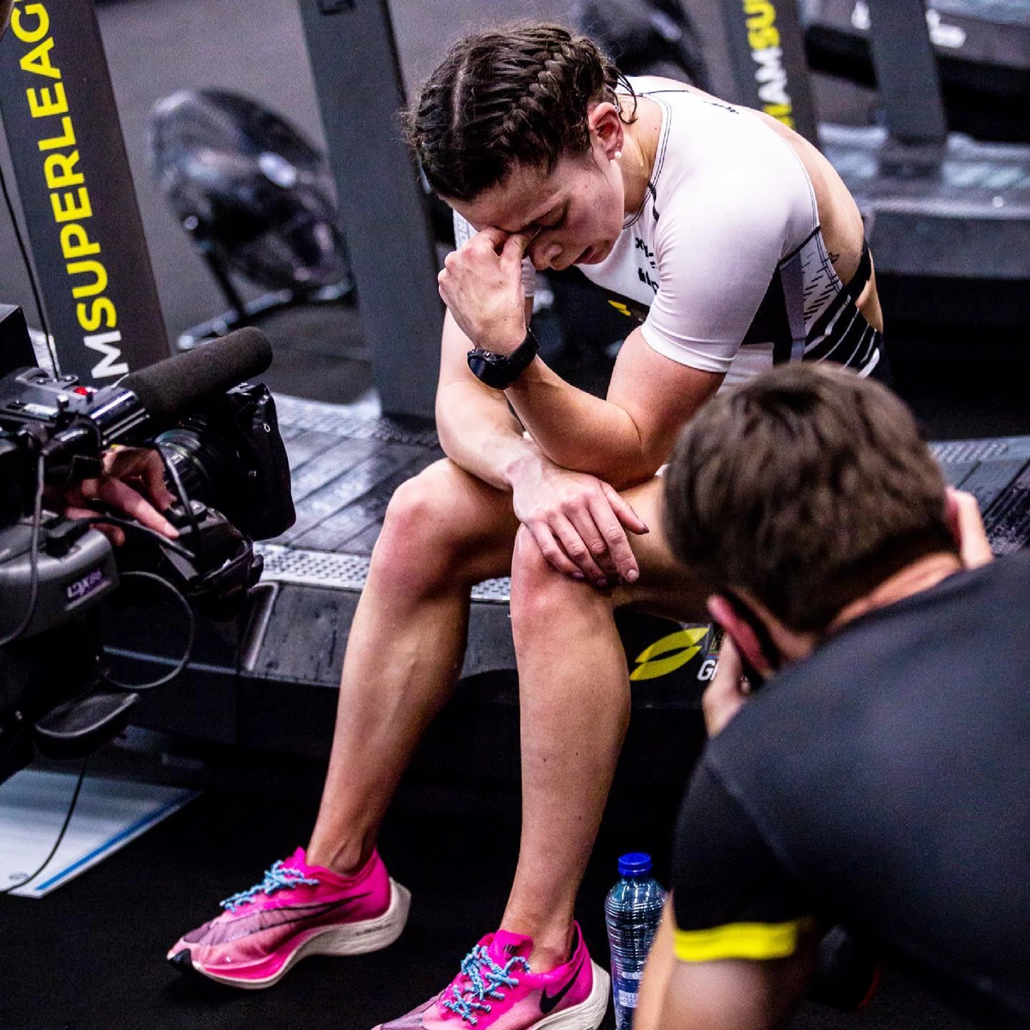 Тем не менее, о Колдвелл не так уж много информации. Это понятно – пока она только на пути к вершинам мирового триатлона, и коронавирус совершенно не вовремя прервал её поступальное движение вверх. Так что SLT Arena Games, как раз и придуманное в качестве альтернативы в период карантина, стало настоящим спасением. На первом этапе Колдвелл не было, зато месяц назад в Лондоне она сразу стала третьей. Тот успех дался очень тяжело, чему свидетельством вот эта фотография.