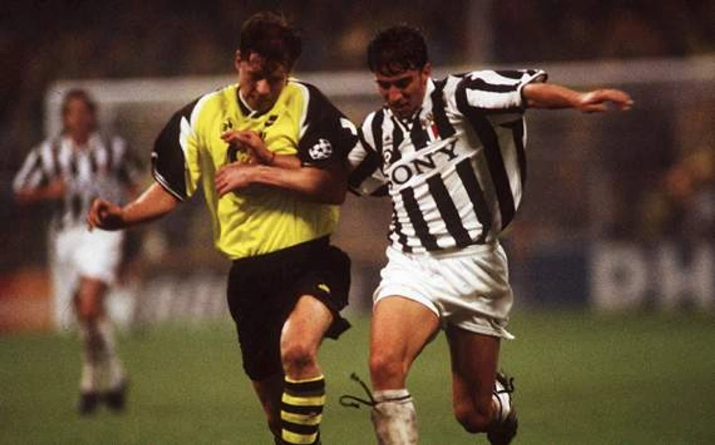 Начинали 13 сентября в Дортмунде под зорким взглядом 39000 зрителей. Начинали плохо. Пока диктор объявлял состав, отличился Андреас Меллёр. «Ювентус» ошибся в защите, центральный защитник Турина исполнил сложнейшую передачу пятками дуплетом под удар Меллёру и немец бабахнул по воротам. Должен заметить, Перуцци допустил ляп в стиле Вальдира Переса и счет стал 1-0. Здесь хочу отметить, что именно Андреас Меллёр был главной звездой «Боруссии». Анди играл на высочайшем уровне лет 5 и именно он был у немцев на ЕВРО-96 лучшим, хотя «Золотой мяч» дали Заммеру (играл прекрасно) и был в форме Клинсманн. Андреас был хорош… Считаю его потерей для «Юве».