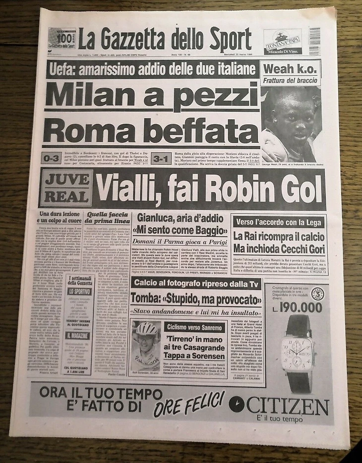 Итальянские СМИ объявили войну всему испанскому футболу, судейскому корпусу УЕФА ( гаденыш Рётлисбергер ), Королевской семье и всему испанскому в стиле незабвенного Барона фон Мюнхгаузена, подданного Российской империи, который объявил войну Британии. В ход пошли как легальные методы, типа «Ювентус» просто сильнее, состав у туринцев более законченный вид имеет, игровые кондиции на высочайшем уровне, Виалли будет играть (это важнейший момент), Дель Пьеро просто фантастический и так далее и тому подобное , так и нелегальные.