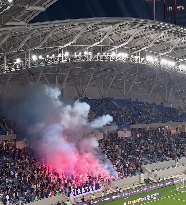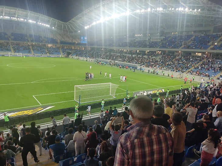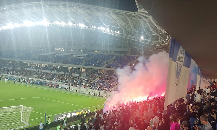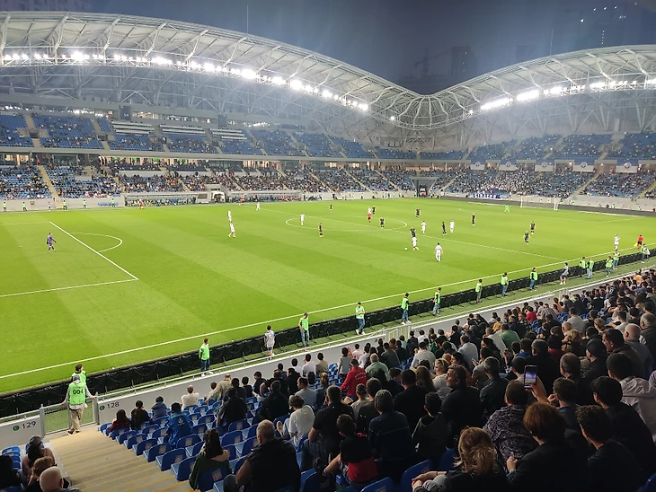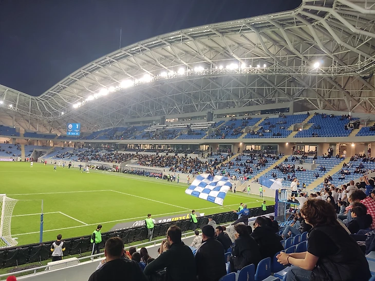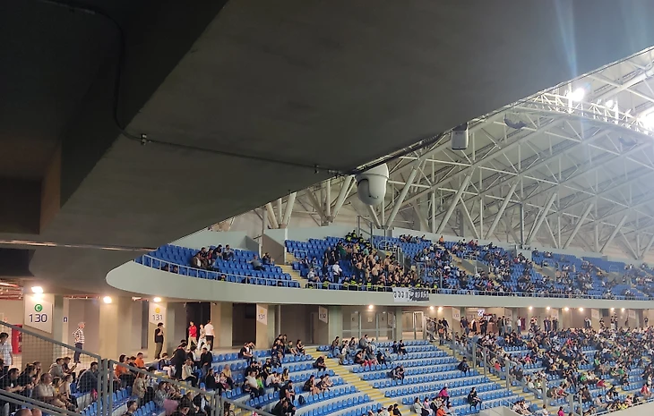 Во-вторых, упомянутый исторический подтекст в отношении Торпедо. Команда с более успешной историей в 20 веке (дважды чемпионы первой лиги СССР), в чемпионате независимой Грузии (4 выигранных титула, один совсем недавно - 2017 году), с активными болельщиками. Последних я надеялся увидеть на выездном секторе, так как до этого гостевой поддержки ни от кого не видел. Надежды были оправданы, хоть и не большой сектор, но с баннерами, чантами и барабаном присутствовал на стадионе.