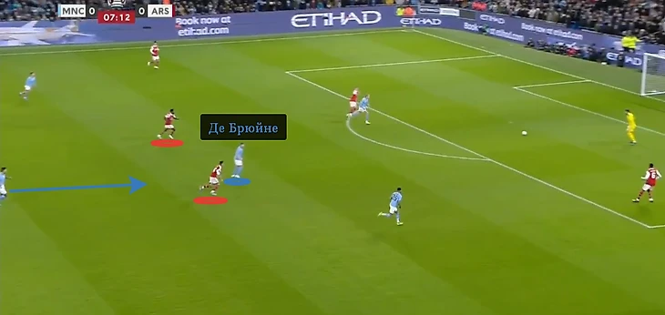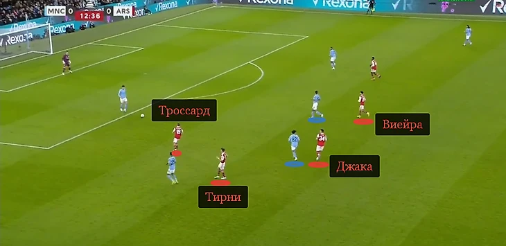 «Арсенал» защищался по схеме 4-1-4-1. Гранит Джака и Фабиу Виейра блокировали двух игроков, которые размещались в опорной зоне «Сити». Первым оставался Родри. К испанцу смещались либо Илкай Гюндоган, либо Рико Льюис.