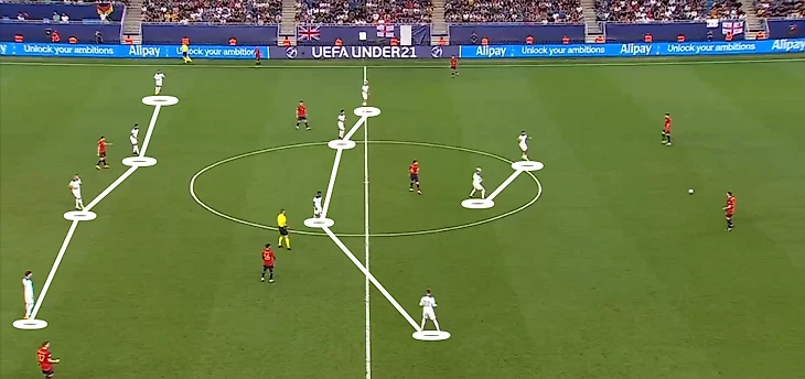 В позиционных атаках испанцы придерживались структуры, при которой к Руису поднимался хотя бы один хавбек, а вингеры держались широко. Передняя линия сборной в красном должна была растягивать английскую оборону.