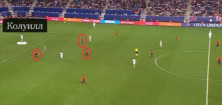 Чужому прессингу испанцы противопоставили личный. Давление Санти Дении работало через блокировку передач. Англичане разыгрывали мяч преимущественно с помощью Колуилла. Соперники перекрывали направления для пасов низом.