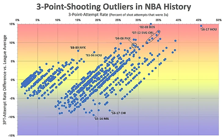 Модные тенденции – трехочковые, повышение темпа, отказ от героического баскетбола в пользу более командных взаимодействий – пленяют далеко не всех. Хотя все данные заверяют, что успех в большей степени должен сопутствовать тем, кто примеряет себя к формулам аналитического баскетбола, работает это все не совсем уж линейно.