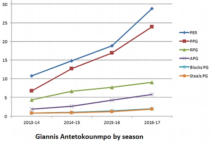 Во-первых, Адетокумбо – лучший в своей команде по пяти основным показателям: у него 23,5 очка, 8,9 подбора, 5,4 передачи, 1,8 перехвата, 2,0 блока.