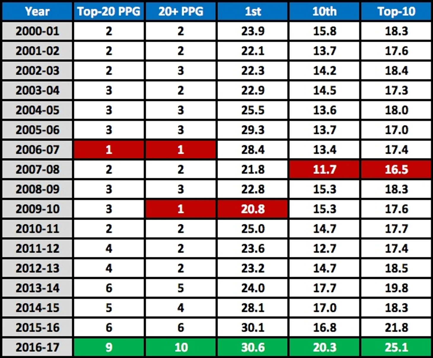 В последние годы с каждым сезоном лига увеличивает темп и, как следствие, результативность. В этом в среднем команды НБА набирают 105 очков за игру. Столь высокие цифры были лишь в конце 80-х-начале 90-х при еще более быстром темпе игры.