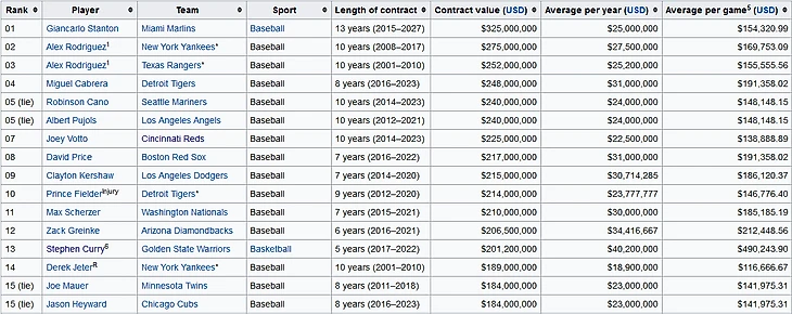 На данный момент самым высокооплачиваемым игроком бейсбольной лиги является Зак Гренке (34,4 миллиона в среднем в год), в НФЛ – это Дерек Карр (25 миллионов), в НХЛ – Коннор Макдэвид (12,5 миллиона).