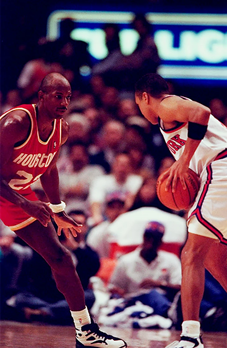 Предыдущим летом «Рокетс» и «Никс» зарубились в финале и ничего, кроме боли, не доставили. Обе команды выступали за максимально жесткий баскетбол под щитами, надеялись на не стесняющихся приемов из единоборств «больших», оперировали при помощи не самых выдающихся защитников и предложили зрителям семь матчей месилова, способного даже в пропорции пять минут к одной рекламной вызывать кровь из глаз. Оладжувон попал в тиски Юинга, Оукли и Мэйсона, Юинг потерялся в объятиях Оладжувона, а количество синяков, ссадин, шишек и других следов боли намного превышало количество запоминающихся моментов. Собственно, из всей серии в истории закрепились два эпизода: блок-шот Оладжувона, показавшего фокус с выдвигающейся рукой против Старкса на исходе шестого матча, и 2 из 18 с игры от бедняги Старкса в седьмом матче.