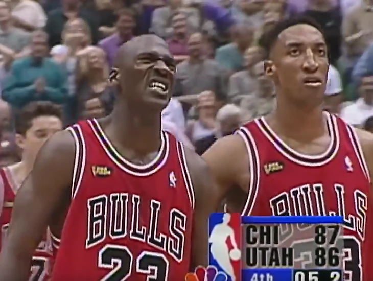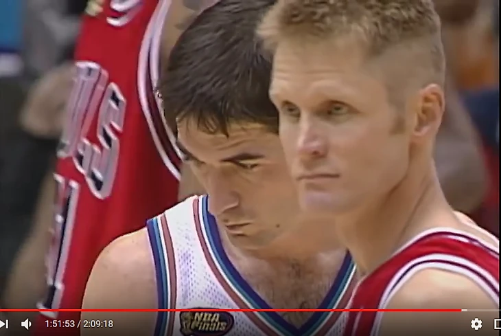 Эта пара уже оказывалась в ровно такой же ситуации в концовке первого матча серии 97-го года. Тогда все завершилось вот таким вот попаданием Джордана.