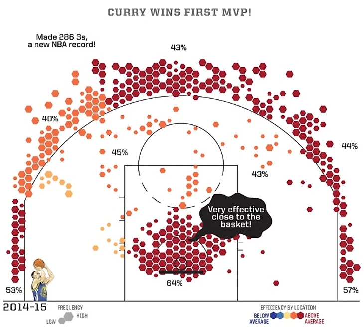 Во-первых, Карри стал лучше в завершающей стадии под кольцом. В сезоне-2014/15, когда в «Голден Стэйт» пришел Стив Керр и заставил разыгрывающего гораздо больше действовать в стороне от мяча, тот удивил под щитом. Из 50 игроков, которые совершили как минимум 350 попыток с расстояния в три метра, Карри оказался восьмым – он реализовывал невероятные 64%!