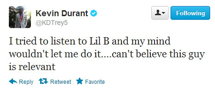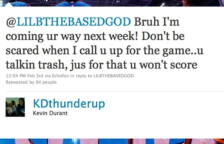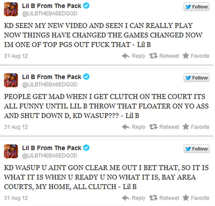 Боевые действия: Во-первых, Lil B «проклял» Кевина Дюрэнта, сказав, что после такого он никогда не станет чемпионом – после всего, что происходит с «Оклахомой» в последние годы, не стоит воспринимать это так беззаботно.