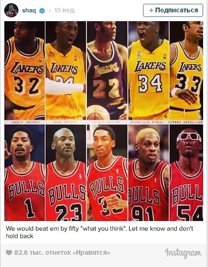 Сборная «Лейкерс» всех времен (Шакил, Мэджик Джонсон, Кобе Брайант, Элджин Бейлор и Карим Абдул-Джаббар) обыграла бы звезд «Чикаго» (Деррик Роуз, Майкл Джордан, Скотти Пиппен, Деннис Родман и Хорас Грант) с разницей 50 очков.