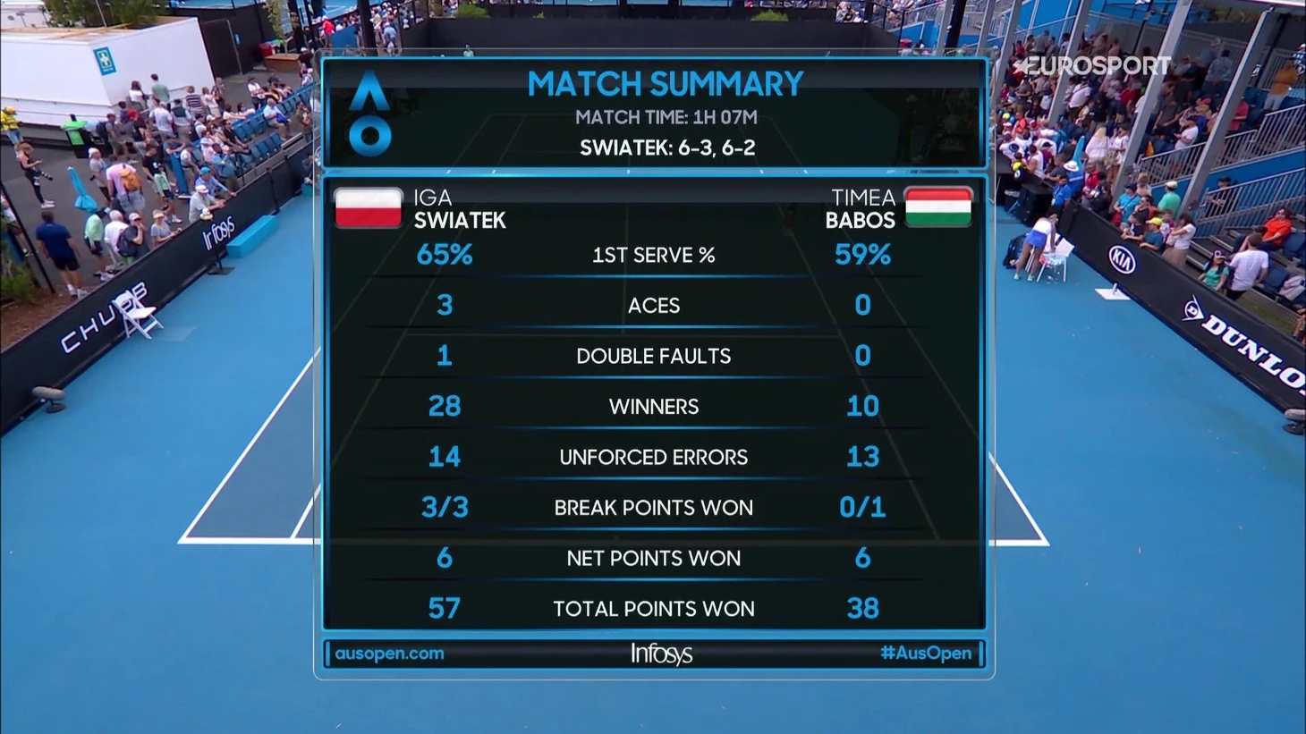 Что касается сегодняшнего матча против Бабош, то Ига провела его очень уверенно. Напоминаю, что это был ее первый матч за последние пять месяцев. Чуть больше часа потребовалось польке, чтобы одержать победу. Ига очень активно атаковала, неплохо действовала на приеме и уверенно держала свою подачу, допустив на ней лишь один брейк-поинт. Собственно, вот статистика матча: