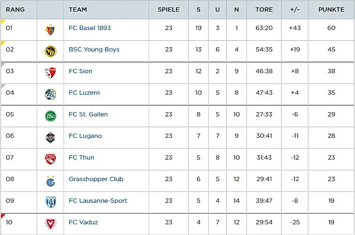 «Базель» потерял очки, но продолжает иметь весомый гандикап от второго места. До 28 тура лидерство точно у них. «Янг Бойз», в свою очередь, пользуется осечками преследователей и отрывается на семь пунктов. «Тун»/«Грассхоппер» и «Лозанна» /«Вадуц» - две пары аутсайдеров, которые не могут быть уверенными в безопасном будущем. Последние две так особенно.