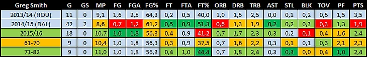 Грэг ничем не запомнился, абсолютно ничем. Его взяли на месяц, чтобы заткнуть дыру под кольцом первым попавшимся куском мяса, и как только Неманья стал подавать признаки жизни, места на площадке Смиту уже не нашлось. Как игрок он крайне ограничен и атаковать может только из-под кольца, а в защите – медленный и неуклюжий (противники бросали против него на 4,1% лучше). Уверен, что у него есть шансы получить место третьего центрового в другой команде, чтобы выходить в мусорное время и служить подстраховкой на случай травмы остальных игроков. Но, поскольку ему уже 26 лет и какого-либо ощутимого прогресса уже не дождешься, то ему лучше задуматься о доминировании в чемпионате какой-нибудь Албании или Беларуси.