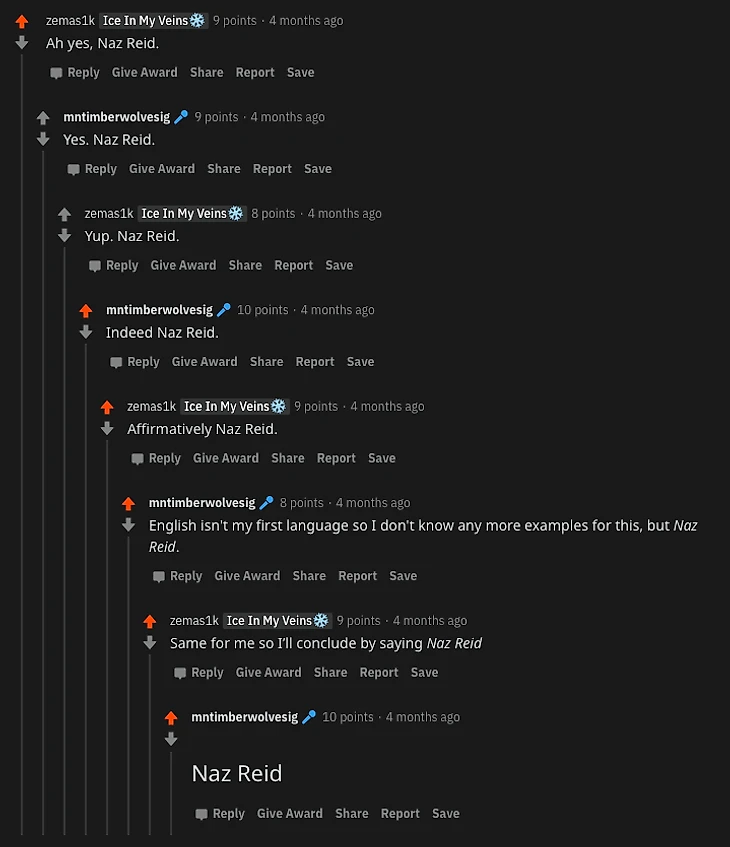Однако рассказ об этом игроке был бы неполным, если не рассказать о феномене Наза Рида на самом крупном в мире баскетбольном сообществе Миннесоты на reddit.com. Дело в том, что в определенный момент любое упоминание о этом игроке на форуме заканчивалось массовыми комментариями с именем игрока. Сумасшествие? Нет, это Спарта Миннесота!
