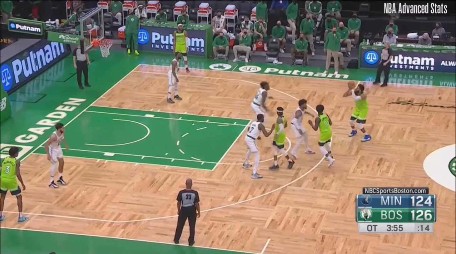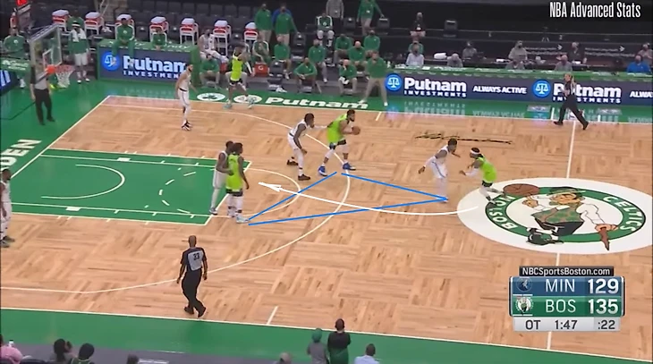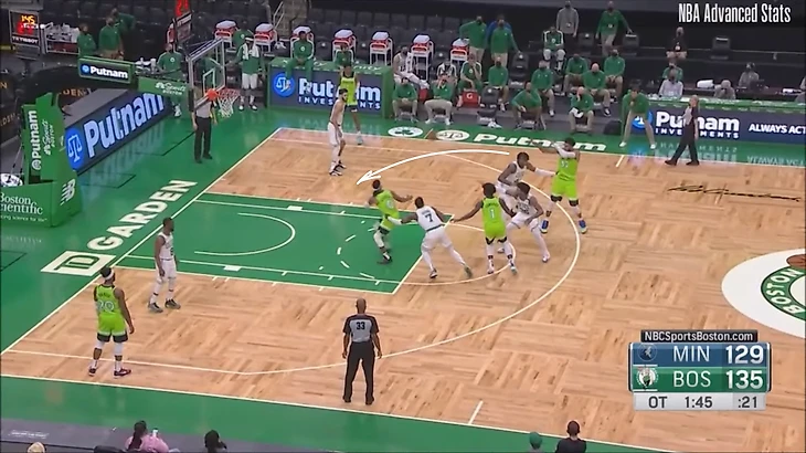 Во втором примере мяч изначально получает Эдвардс, а Расселл ставит заслон Таунсу, которого выводят на открытую трешку.