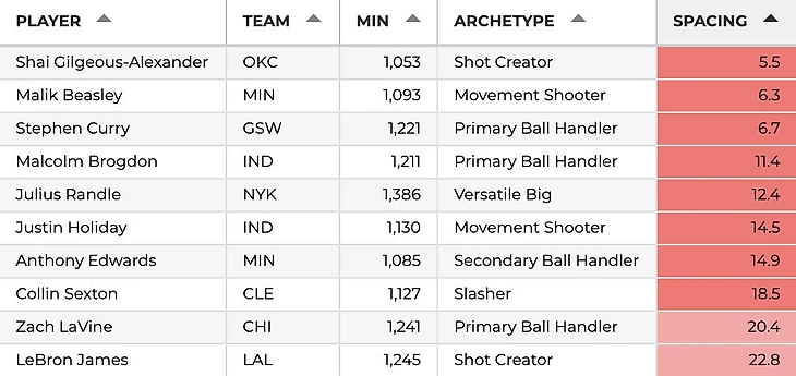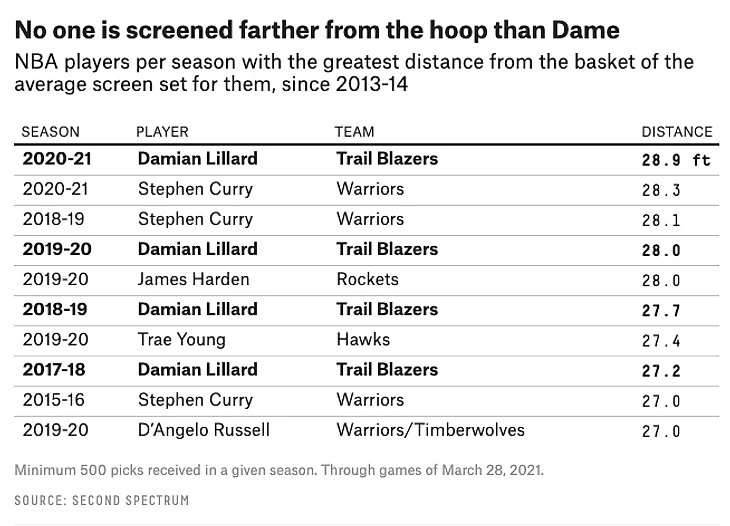 Одна из интересных метрик, связанных с Расселлом – это расстояние от кольца, на котором ему ставили заслон в прошлом сезоне. И тут наш разыгрывающий в одной компании с Дэймом, Карри, Харденом и Янгом. А как я уже рассказывал в своих предыдущих текстах, высокие заслоны и сверхдальние броски – это тренд сезона: чем выше заслон, тем меньше шансов у защиты подстраховать, изолировать игрока на мяче, изменить направление атаки.