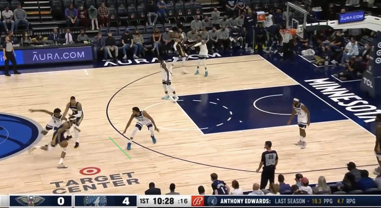 Новая схема игры в защите. При Тибодо мы играли «ice», при Сондерсе/Вантерпуле «drop». При этом в защите мы были стабильно среди худших команд NBA. В этом сезоне внесли несколько принципиальных изменения в игру в защите. Во-первых, Таунс при защите от пик-н-ролла поднимается гораздо выше чем при «drop» схеме, встречая игрока с мячом на уровне заслона. Ниже пример из предсезонной игры против Нью-Орлеанс, где Таунс встречает Ингрэма на трехочковой дуге. Обратите внимание на Расселла, который рукой показывает Эдвардсу, что тот должен придержать набегающего на кольцо после пик-н-ролла центрового соперника.