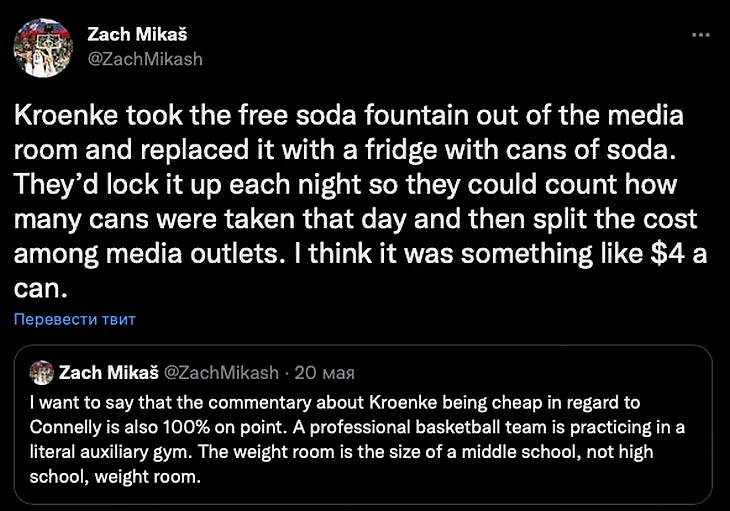 В чем же цимес, спросите вы? Давайте вернемся в изначальную точку, а именно к вылету «Миннесоты» из плей-офф в первом раунде. В такой ситуации кто-то из владельцев молодых команд пытается самостоятельно найти на драфте нового Леброна, Кобе, Карри (подставь наиболее хайповый архитип), кто-то пытается купить звезду любой ценой, кто-то любит и ищет тренеров, которые «в защите пожестче». Что делают на их месте новые владельцы «Миннесоты»? У них есть Гупта – неплохой кандидат на должность президента, но они вкладываются в Коннелли, опытного управленца, который в условиях серьезных ограничений, несколько лет подряд руководит Денвером, командой (как и «Миннесота») с маленького рынка, с сильным характером, самым нетипичным MVP последних лет и скупым владельцем. К слову владелец «Денвера» Стэн Кронке давно известен своей непомерной жадностью, к примеру, «Денвер» на пару с «Хьюстоном» Фертитты – это единственные две организации НБА без собственных, современных тренировочных комплексов, у «Денвера» у одних из последних в Лиге, лишь год назад появилась дочерняя команда в Лиге Развития, у организации проблемы с вещанием матчей и посещаемостью стадиона, плюс из-за нежелания владельца платить тренерскому штабу из «Денвера» постоянно уходили сильные ассистенты тренера и менеджеры, достаточно вспомнить Масая Уджри. А как Вам история про то как Кронки настоял в 2013-м году, чтобы Коннелли обменял выбранного «Денвером» Гобера на Эрика «кто-это-черт-побери» Грина и кэш? Все еще не прониклись? Тогда прочитайте фантастическую историю, как Кронке экономил на баночках содовой.