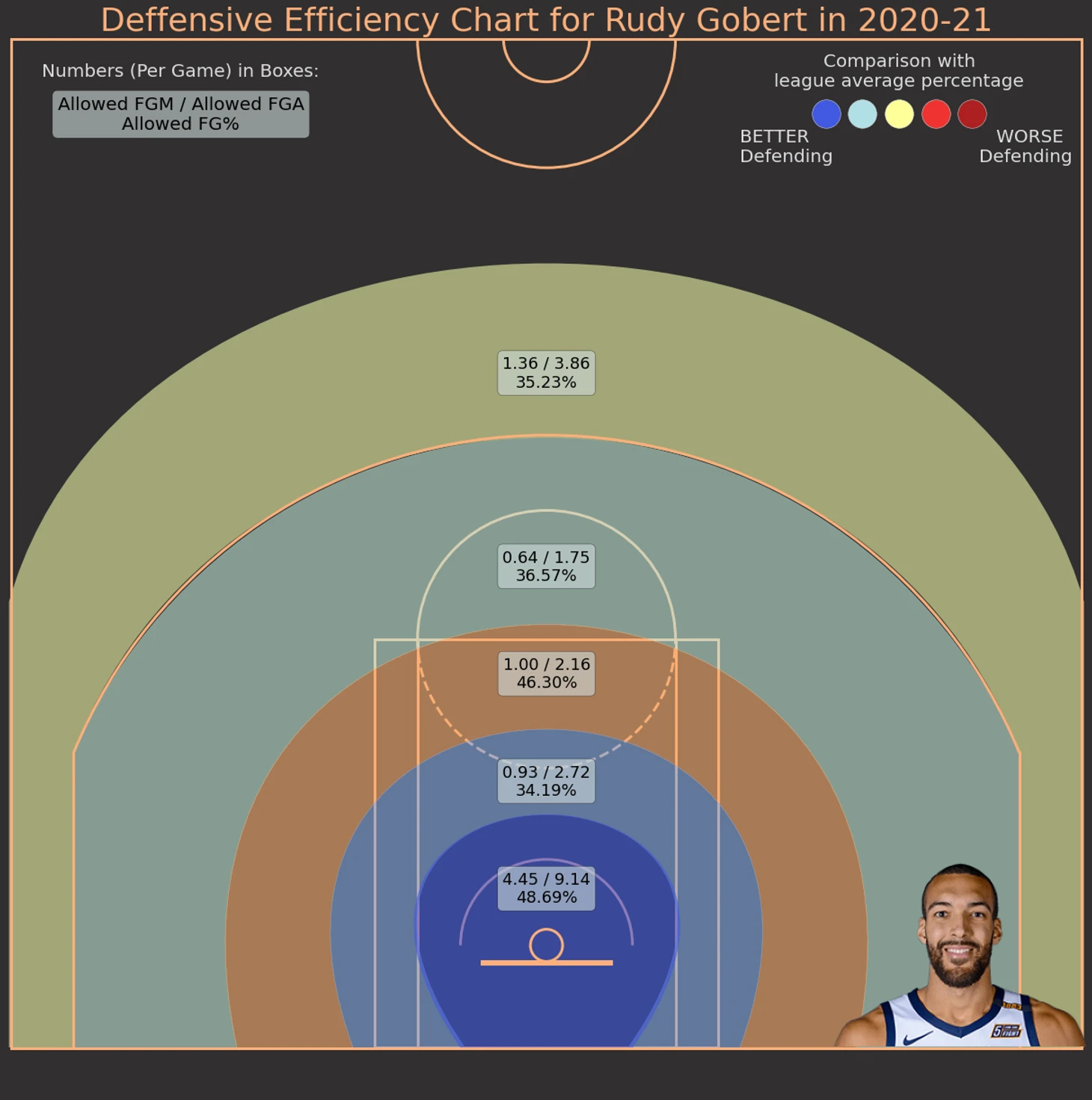 Ниже график, наглядно показывающий как присутствие Гобера влияет на точность бросков соперника, Гобер доминирует в защите и это ни разу не преувеличение. Напомню, что делал он это играя в прошлом сезоне с такими монстрами в защите как Конли, Митчелл, Кларксон и Богданович.