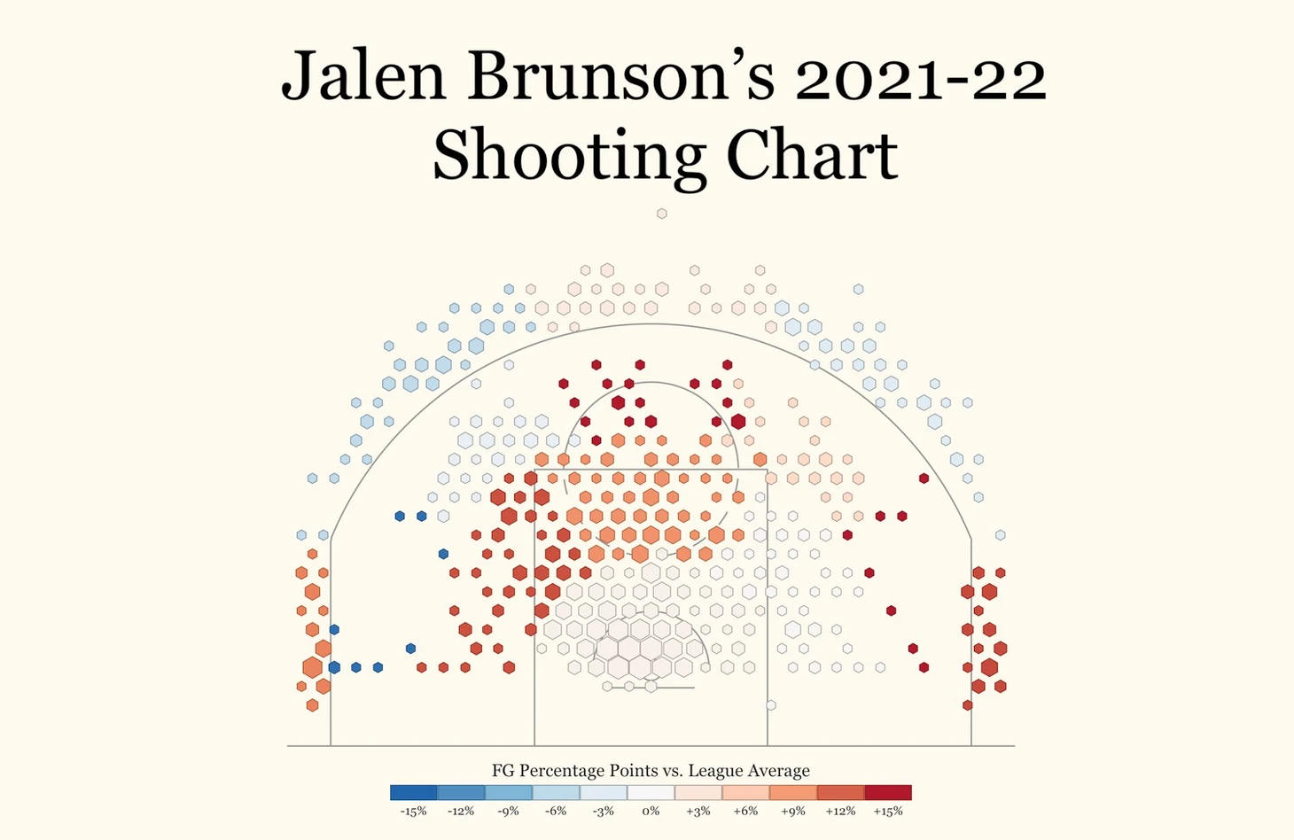 Почему я говорю что хорошая защита должна быть проактивной, готовой к различным противостояниям? Брансон, сыграл «серию жизни» против Юты в шести матчах он забивал за игру 27.8 очков с фантастической для маленького реализацией 48.4% с игры, 36.4% из-за дуги, плюс 4.8 подбора, 4.2 передачи. Ниже карта его бросков, совместите ее с зонами эффективности защиты Гобера и поймете, почему Юте было предначертано отлететь от Далласа, а Брансону подписать контракт мечты с Нью-Йорком. Юта попала на самого неудобного оппонента и ничего не предложила в защите, ведь сложно что-то изменить в схеме защиты, когда твой лучший персональный защитник это Ройс О’Нил, самый большой винг это Богданович, а еще надо спрятать Митчелла и Конли.