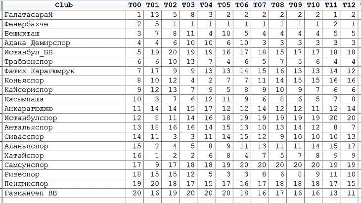 дебютанты – Пендикспор (20->15), Самсунспор (19->19).
