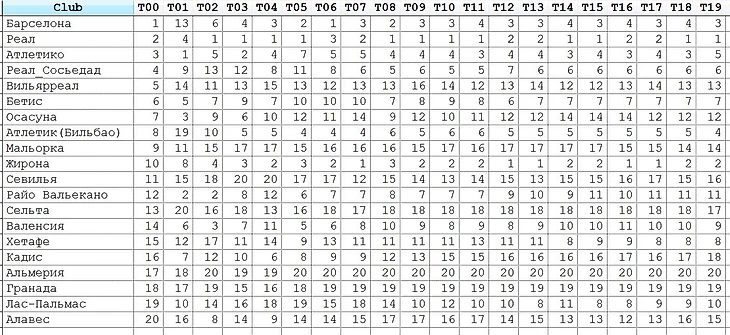 Сельта откатилась(13->17).Далее новичок Гранада(19) Альмерия(20),причем у нее только 5 очка и нет побед(худшая в топ 10).