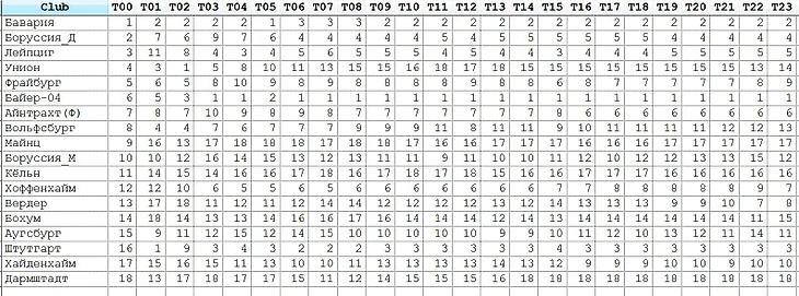 Стабильны Вольфсбург(8->13), Айнтрахт(7->6), Боруссия М(10->12)