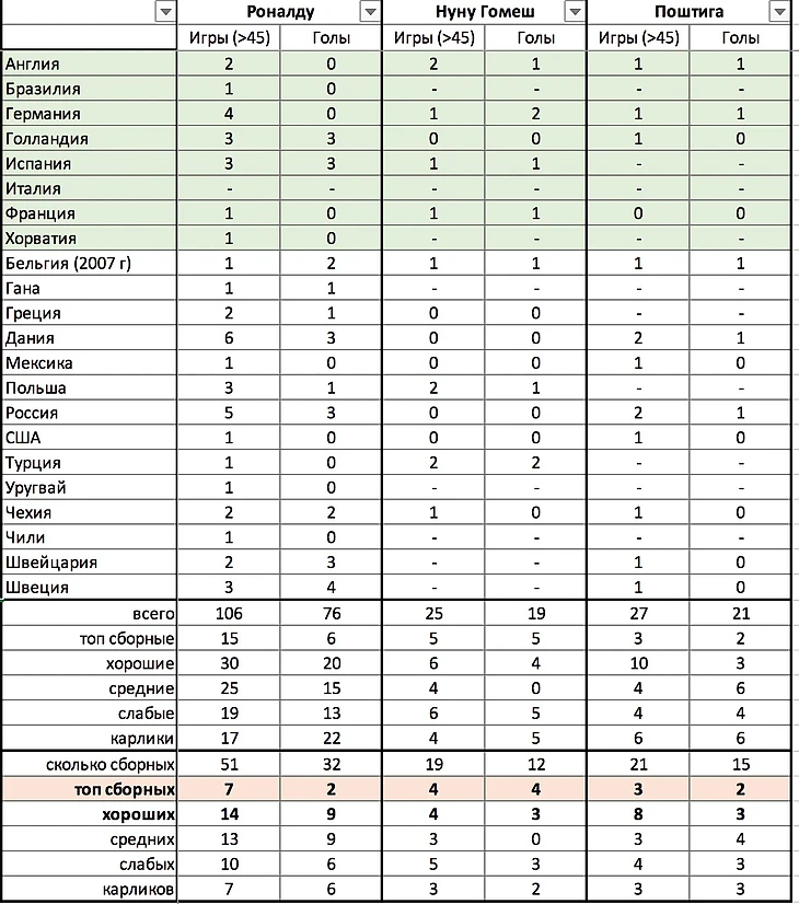 Если объединить топов с "хорошими" соперниками, то у Роналду получится 11/21 – то есть половина. У Гомеша 7/8 – по абсолюту меньше, но эффективность зашкаливает. У Поштиги 5/11 – тоже, в общем, не позорно.