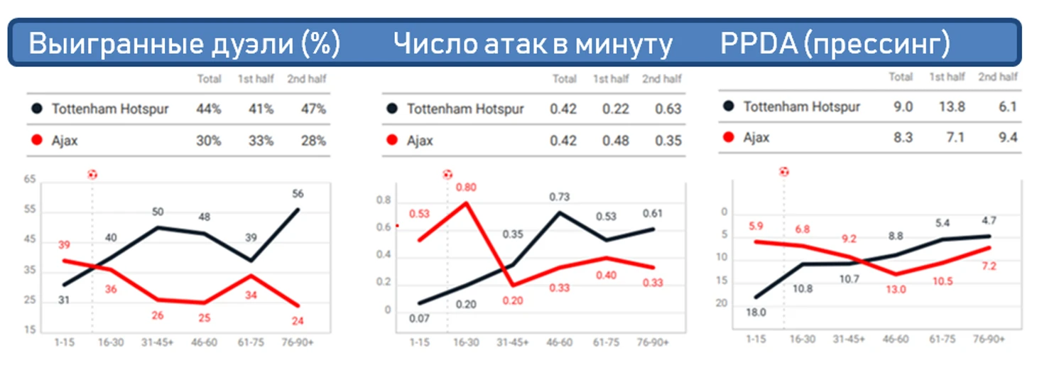 У лондонцев стало на 1 игрока больше в середине поля, а "Аяксу" стало гораздо сложнее разгоняться фирменными перепасовками с участием хаотично перемещающихся игроков разных позиций. Вязкий центр из разрушителей команды Почеттино сначала помог охладить молодой амстердамский пыл, лишив их свободы стартового отрезка матча, а затем начал позволять Тоттенхэму строить свои уже на что-то похожие атаки с проникающими передачами низом. Начиная с 40-й минуты "шпоры" были сильнее практически во всех компонентах игры, кроме, пожалуй, качества завершающей стадии атак.