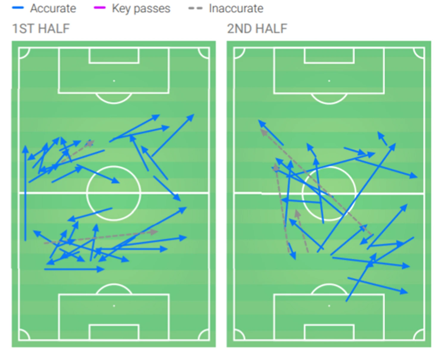 Как видно из диаграмм ниже, "Тоттенхэм" после замены Вертонгена больше владел мячом, точнее пасовал, делал на 50% меньше длинных передач чем в начале игры.