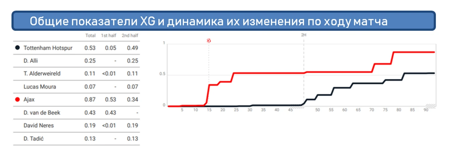 Эти диаграммы подтверждают ошибочность стартовой стратегии Почеттино и верность решения отойти от неё после травмы Вертонгена. "Тоттенхэму" не хватило качества не только атак, но и самих атакующих игроков. Переход в верхнюю треть был, что косвенно показывает одна из характеристик “non-shot XG” так называемые "deep completions" (передачи в радиусе 20 метров от ворот соперника), по которым "Тоттенхэм" почти не уступил "Аяксу" (11 против 12). Однако извлечь реальной пользы от переходов на половину соперника "Тоттенхэм" так и не смог, исполнителей уровня Кейна и Сона в этот вечер в составе «шпор» не нашлось. Футбол не терпит сослагательного наклонения, поэтому оставим рассуждения на тему «а если бы на поле был…».
