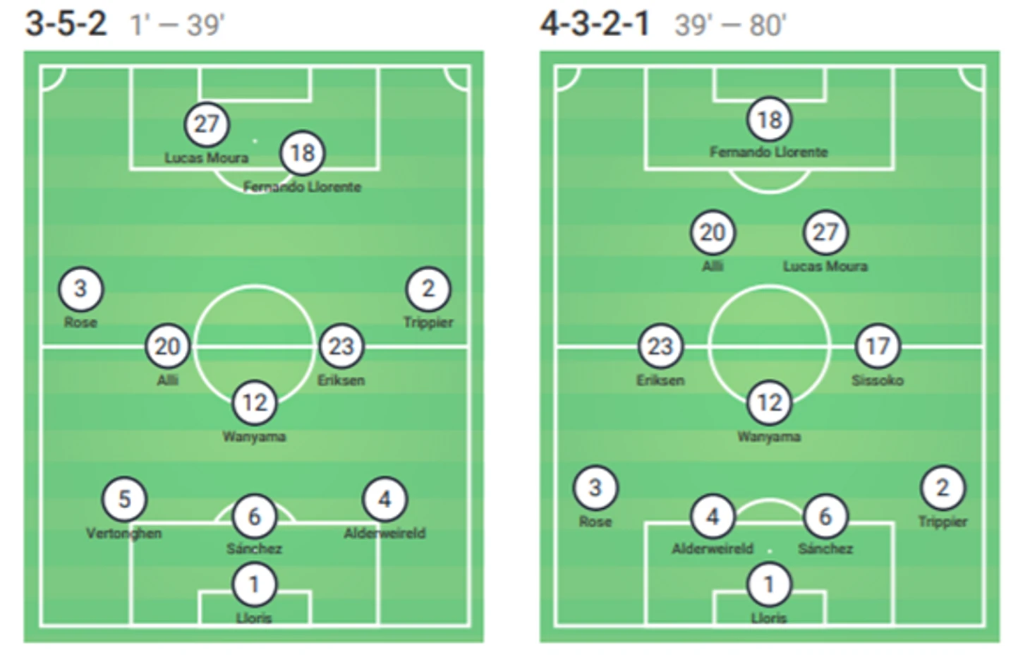 Несчастье в виде неприятной травмы Яна Вертонгена неожиданно помогло "Тоттенхэму" оживиться. Вместо бельгийца на поле появился Сиссоко, это событие кардинальным образом изменило игру. Схема "шпор" из стартовой «3-5-2» превратилась в максимально плотную в середине поля «4-3-2-1».