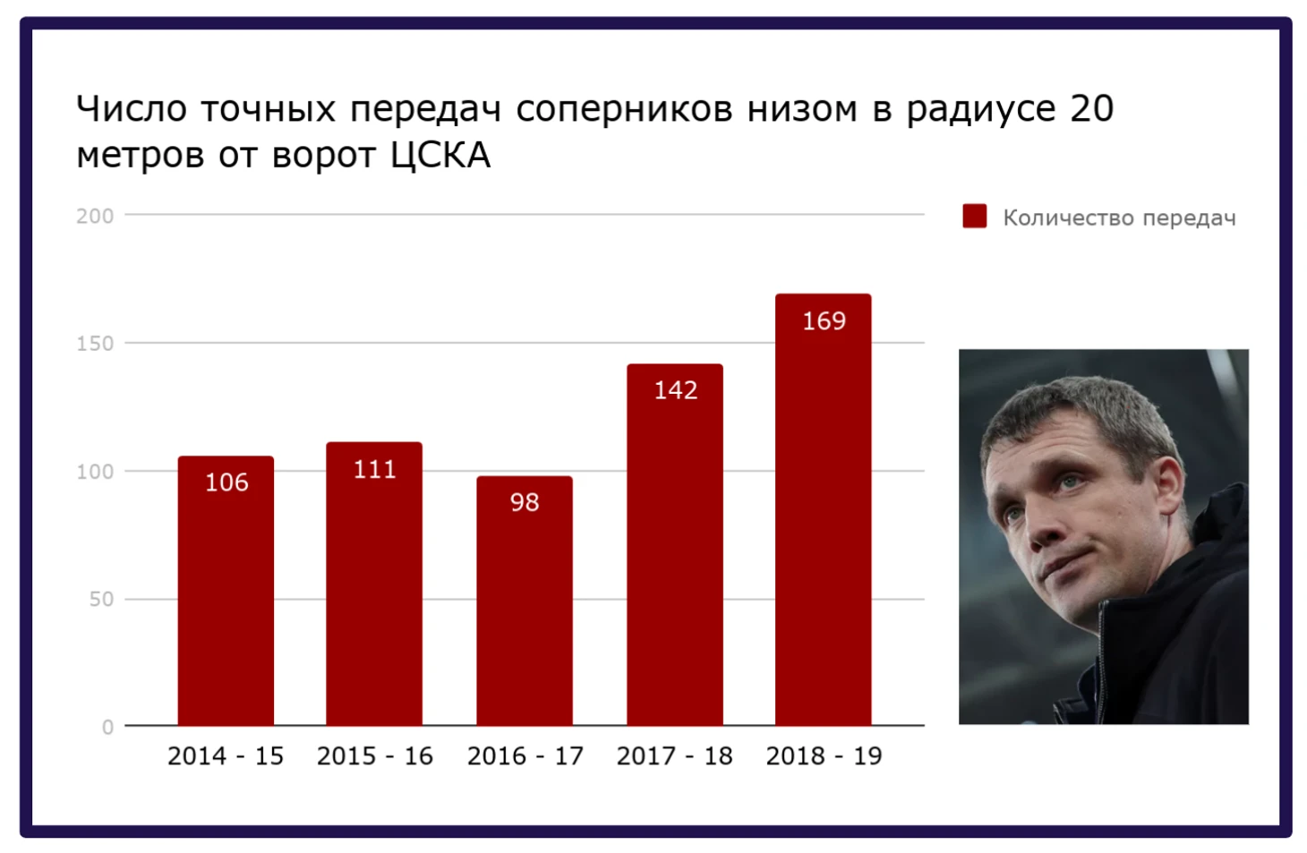 Сочетание слабости опорной зоны армейцев в позиционной обороне и слабой адаптации к её ошибкам защитной линии красно-синих является серьёзной проблемой команды Гончаренко. ЦСКА в текущем сезоне на 9-м месте в РФПЛ по числу допущенных точных передач низом в радиусе 20 метров от своих ворот, и это худший результат армейцев за последние 5 лет. Тенденция крайних двух сезонов говорит о том, что в опасную близость к воротам красно-синих сопернику проникать всё легче. Тогда зачем вообще нужна эта схема с тремя центральными защитниками, если она настолько сложная в реализации, не добавляет надёжности и убирает из атаки, как минимум, одного игрока. Очевидно, молодому ЦСКА нужно было наигрывать что-то другое, более гибкое, агрессивное и простое в исполнении.